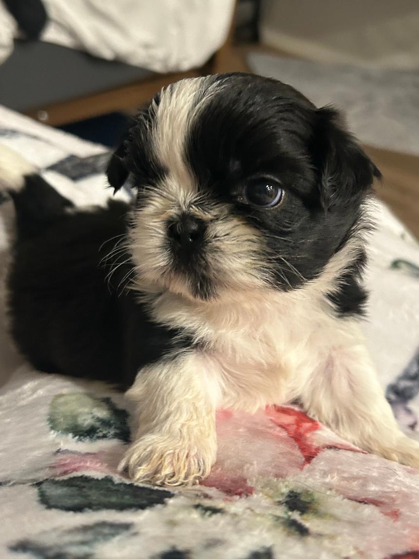Typical Puppy starter package goes with EACH puppy: The kits normally include a tote bag, a lamb chop squeaker dog toy, food and water bowl, package of puppy chow, bed pad, nail clippers, puppy shampoo, can of wet puppy food, bands for top knot, dog shedding brush and a 20 page hard back photo book which shows photos of parents, grandparents, great-grandparents, etc. (Style and color of the items may vary from what is pictured)